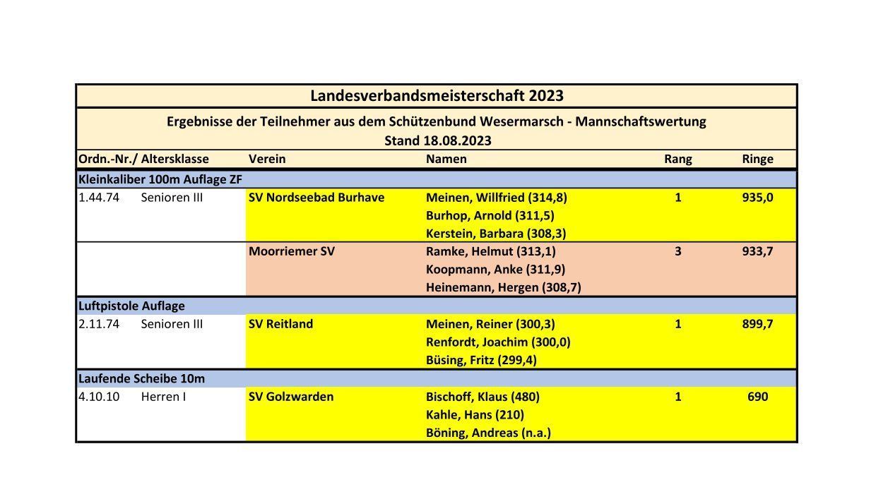 In 2023 nahmen insgesamt 52 Sportschützen aus 10 Schützenvereinen der Wesermarsch an der Landesverbandsmeisterschaft teil.  In 20 Disziplinen und den jeweiligen Altersklassen standen Sportschützen aus der Wesermarsch in der Einzelwertung 23 mal auf dem Siegertreppchen, in der Mannschaftswertung holten sie fünfmal Edelmetall. Am erfolgreichsten waren die Teilnehmer des Moorriemer SV mit dreimal Gold, zweimal Silber und einmal Bronze, vor dem Braker SV mit dreimal Gold, einmal Silber und einmal Bronze. Der SV Reitland und der SV Golzwarden errangen  jeweils zwei Goldmedaillen..