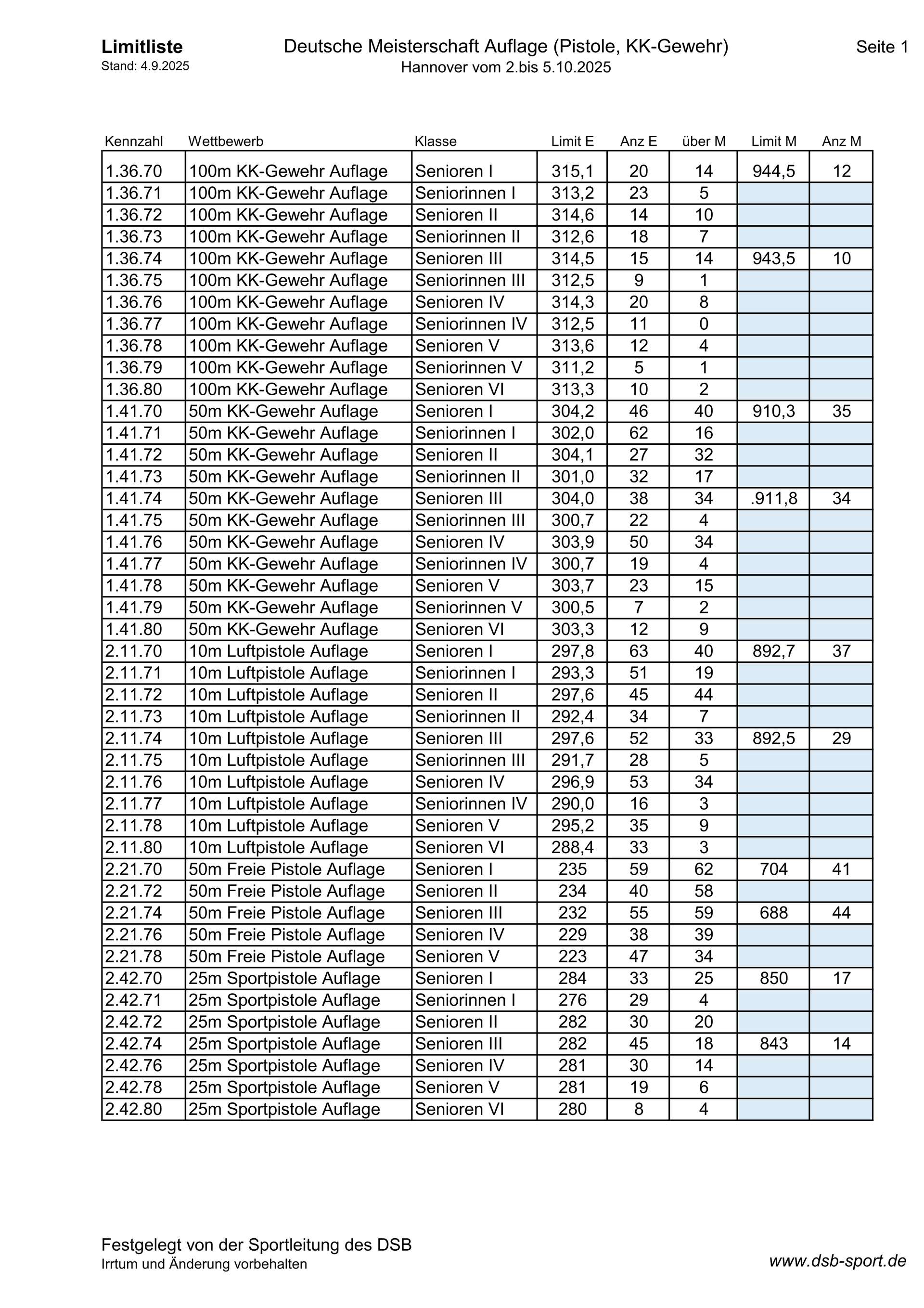 DM 2025 - Limitlisten LG-Auflage Dortmund und Pistole-/KK-Auflage Hannover