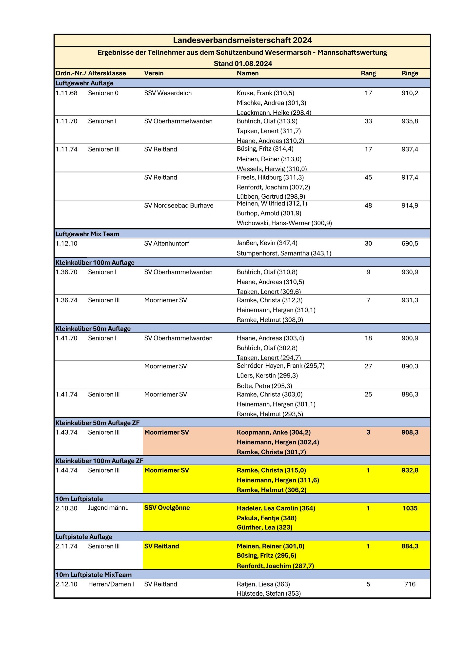 In der Mannschaftswertung (Senioren 0) waren die Sportschützen des Moorriemer SV 1910, Petra Bolte, Iris Mosler und Birgit Poppe mit Silber erfolgreich (833,7 Ringe), in der Mannschaftswertung (Senioren III) die Sportschützen des SV Reitland 1954, Reiner Meinen, Barbara Kerstein und Fritz Büsing mit Silber vor der Mannschaft des Moorriemer SV 1910, Heiko Schröder-Hayen, Christa Ramke und Helmut Ramke, die sich die Bronzemedaille sicherte.