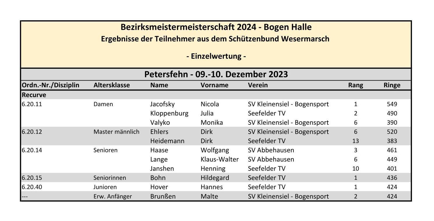 Für die Bogenschützen begann das Wettkampfjahr 2024 mit der Bezirksmeisterschaft 2024 in der Sporthalle von Petersfehn bereits im Dezember 2023. Aus der Wesermarsch nahmen elf Bogenschützinnen und Bogenschützen aus Abbehausen, Kleinensiel und Seefeld mit ihren Recurvebogen teil.